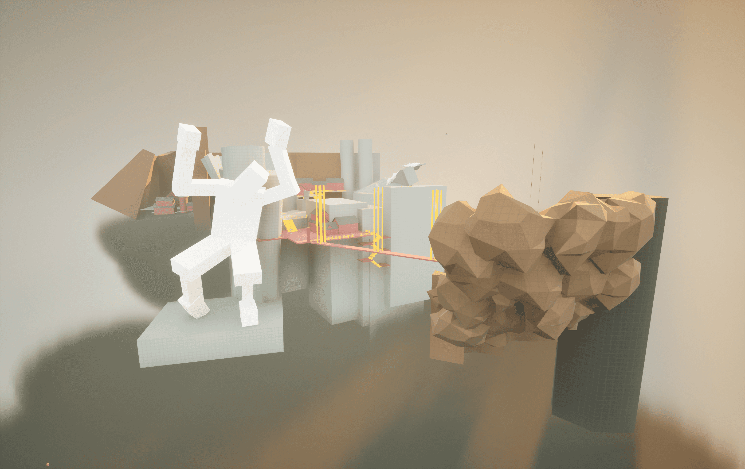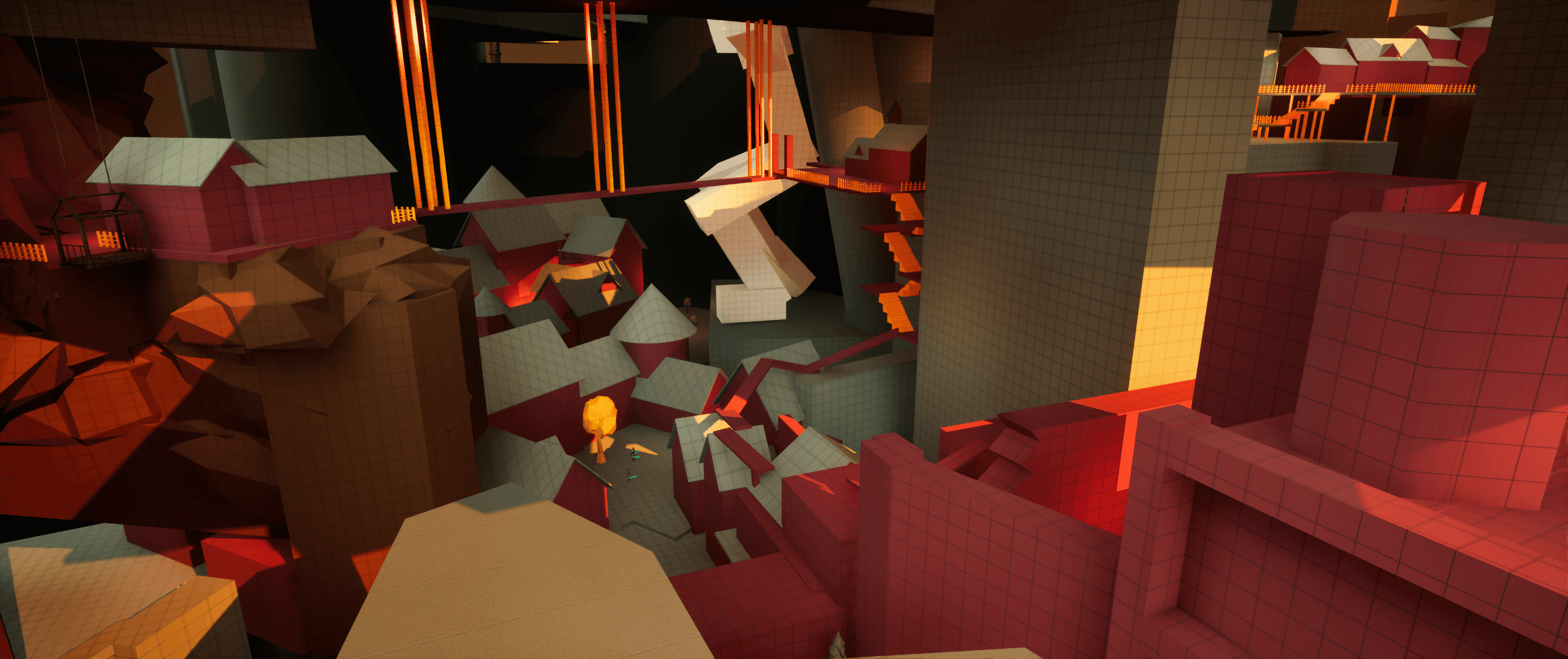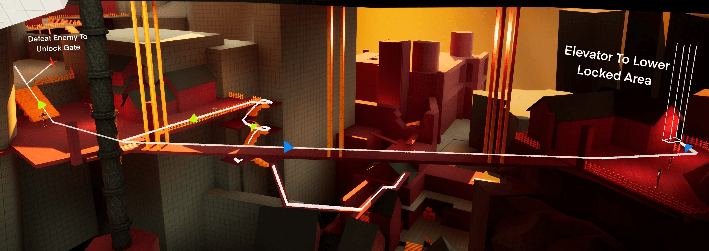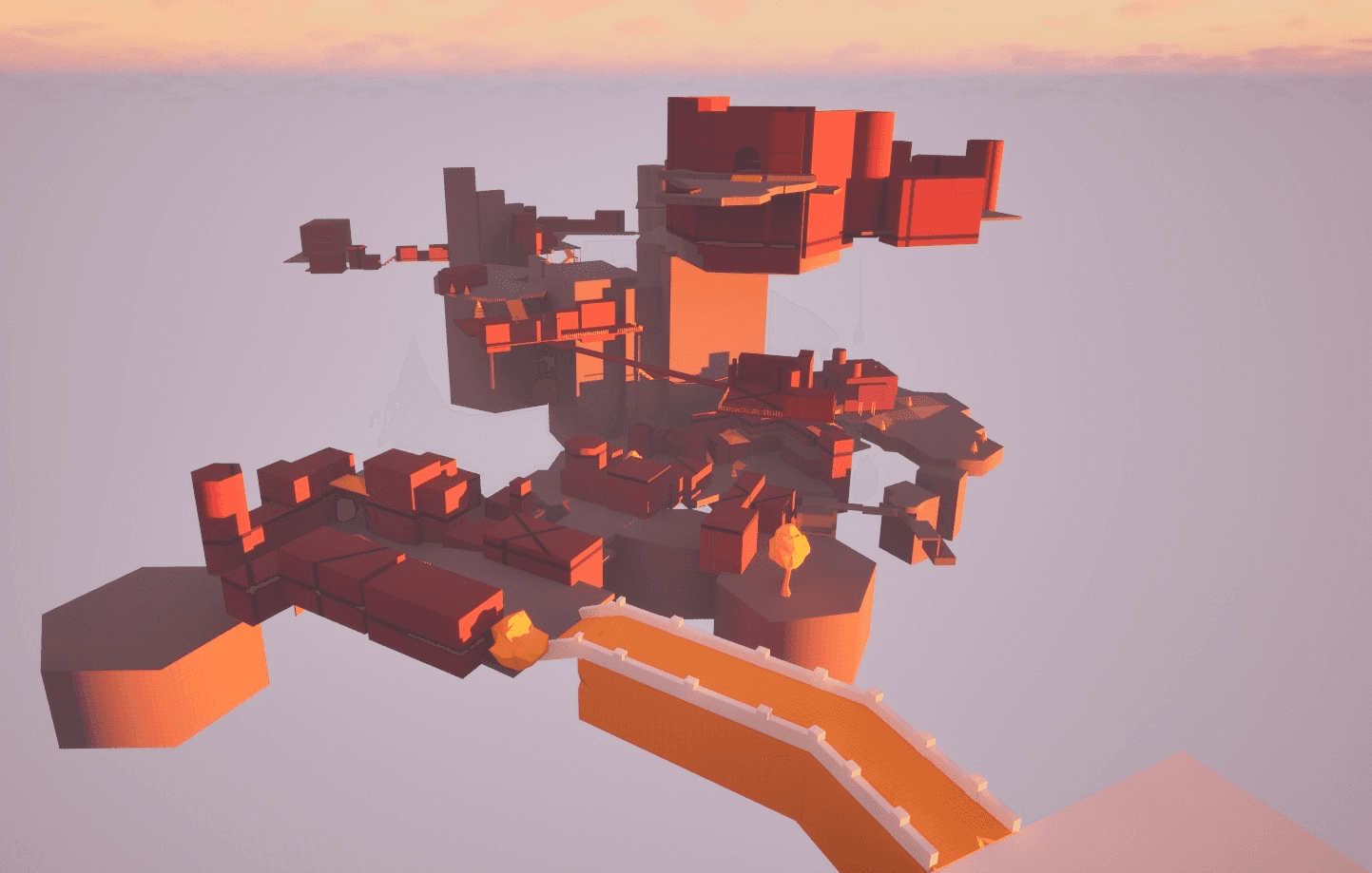 I built the level in three main sections and tried to make verticality a big part of the experience. I wanted players to constantly spot interesting views, notice places they might reach later, and feel pulled toward exploring. Some routes involve a bit of risky platforming, but I like giving players the option to take those chances and earn something extra for going off the main path.