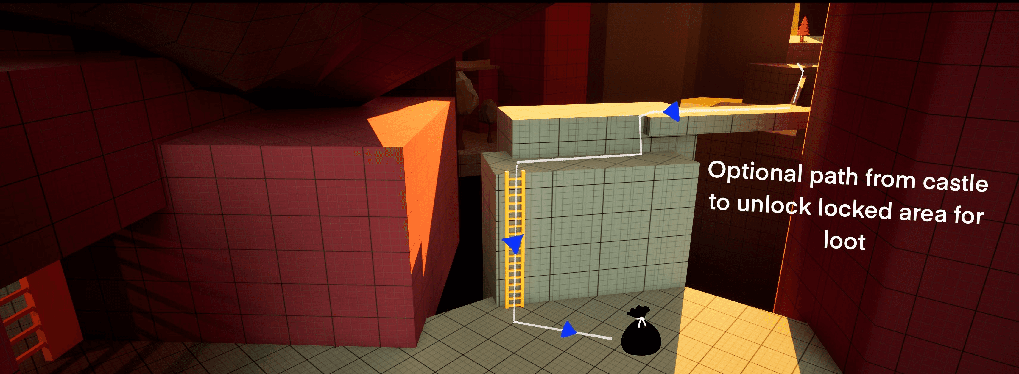 When the player enters this area, they’ll notice a locked gate, but it isn’t meant to be opened from here. Later in the level, they can reach this locked section either by taking an optional path from the castle or by riding an elevator from the middle area. This creates a nice shortcut and makes the world feel more connected.
